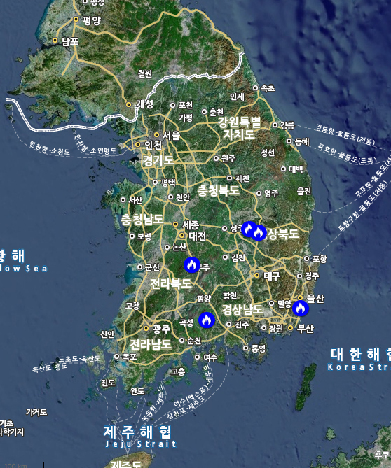 - 고정익 비행기 : 해양경찰청 항공기로 산불 최외곽 좌표 탐지