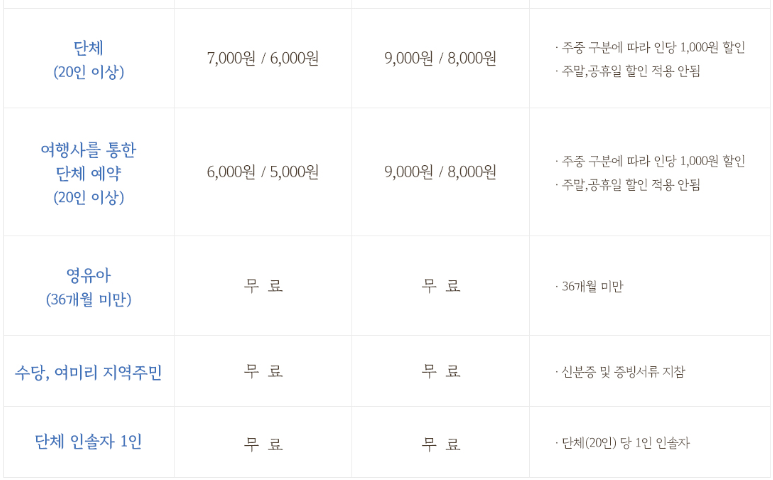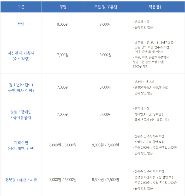 - 입장료: 성인 8,000원 / 서산관내 이용자 7,000원 / 청소년(어린이) 7,000원 - 평일기준
