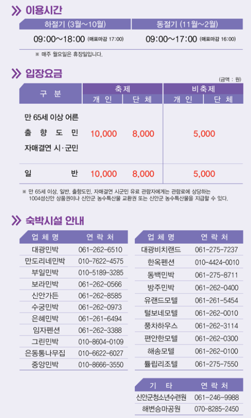 - 실시간 개화 상황은 신안군청 또는 축제 홈페이지 참고