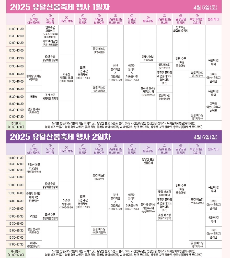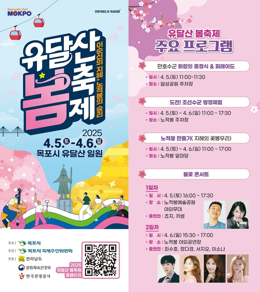 박홍률 목포시장은 “2025 유달산 봄축제는 이순신 장군의 지혜를 통해 목포의 역사자원을 널리 알리고, 시민과 관광객 모두가 목포의 봄을 오감으로 만끽할 수 있는 축제가 될 것”이라며 많은 참여를 당부했습니다.